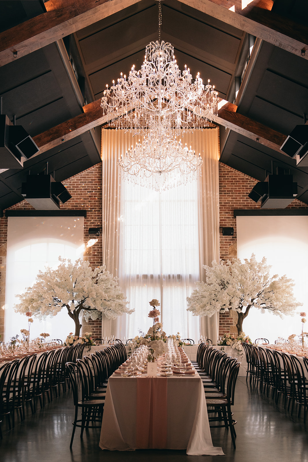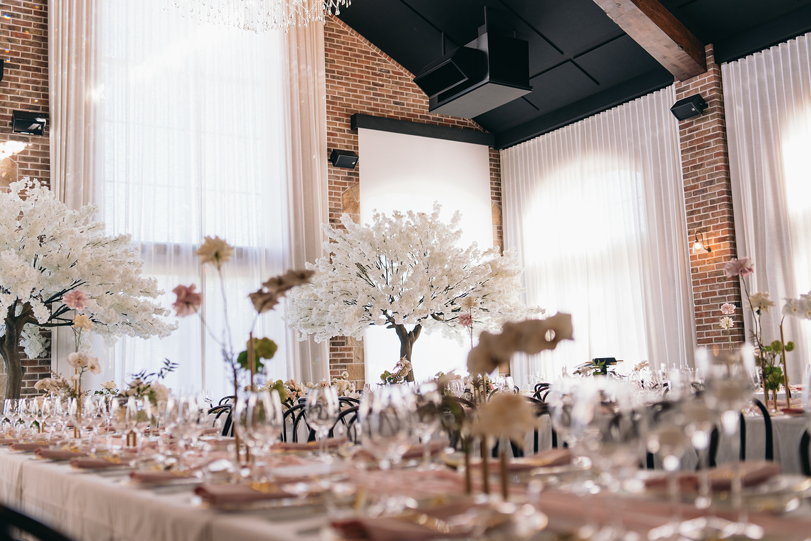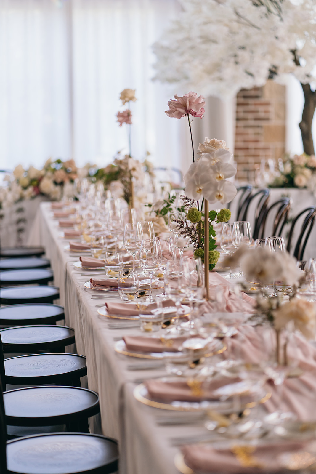 This luxury Gold Coast wedding at The Valley Estate featured a romantic blush and white colour palette, styled with premium faux cherry blossom trees, reflexed roses, and soft pink table runners. Our team delivered full wedding styling & design, and elegant hire pieces to create a dreamy and timeless celebration.