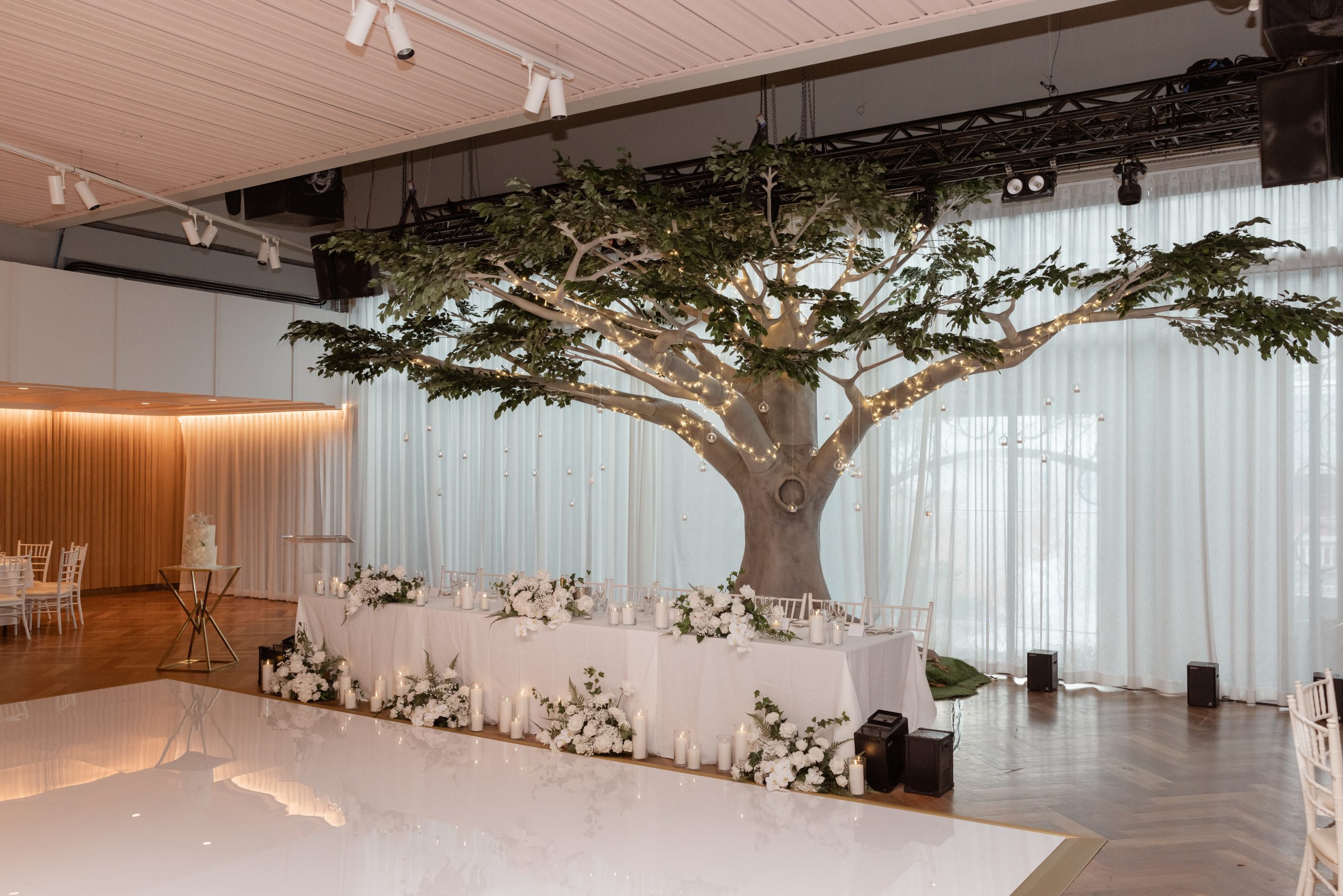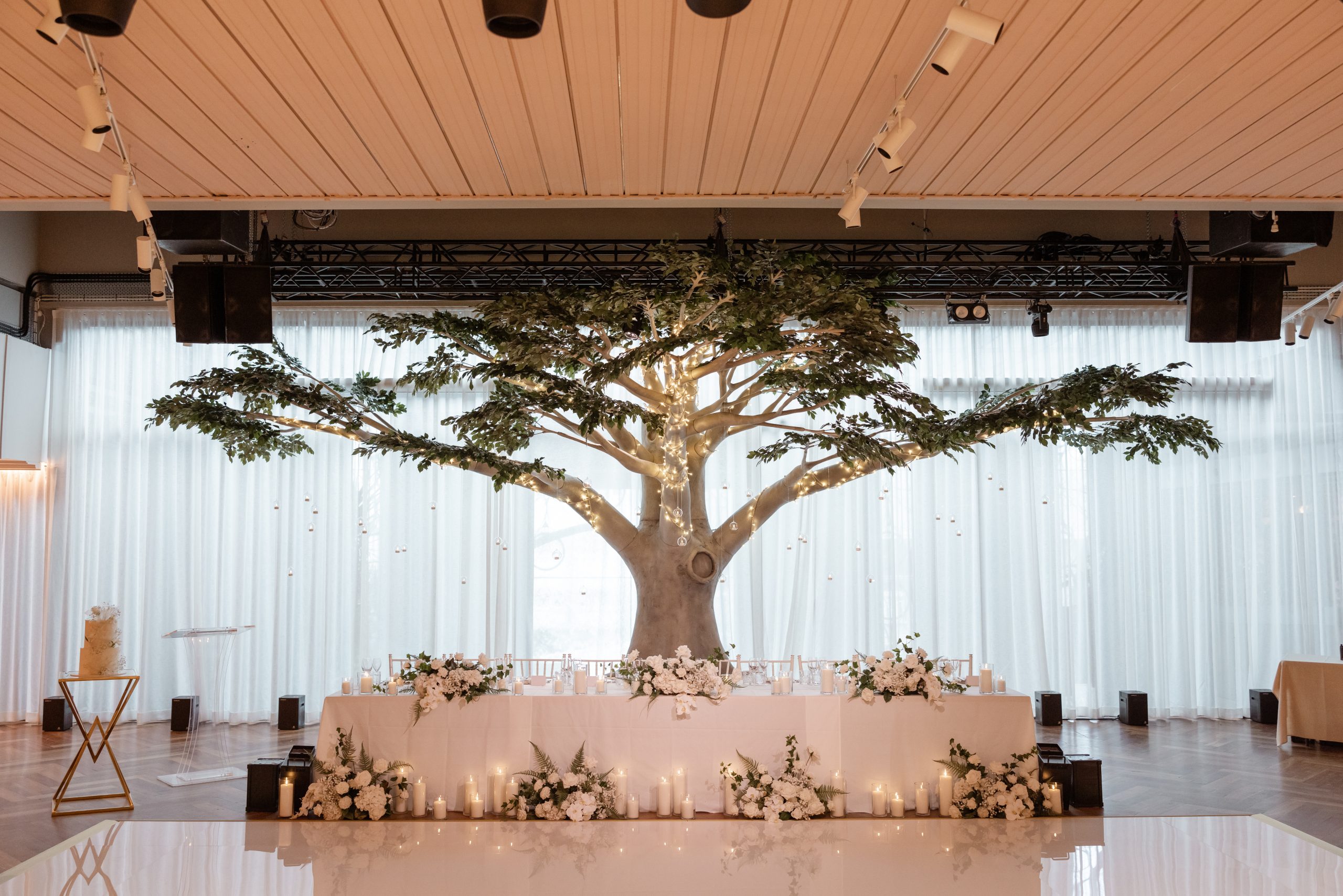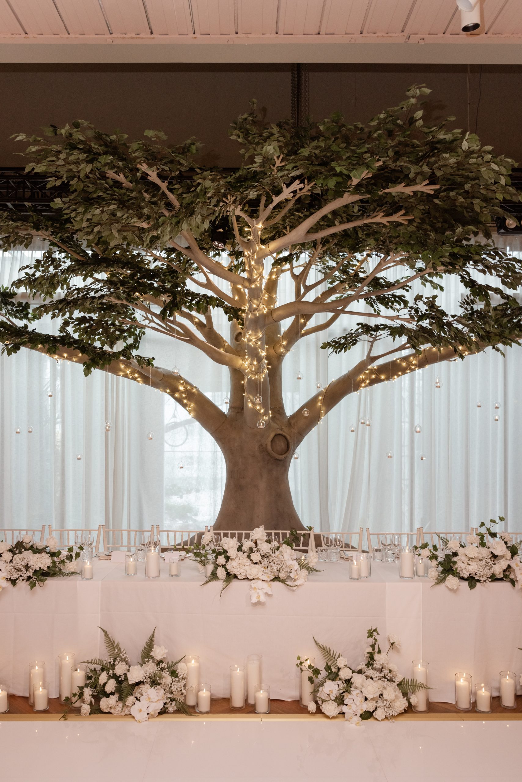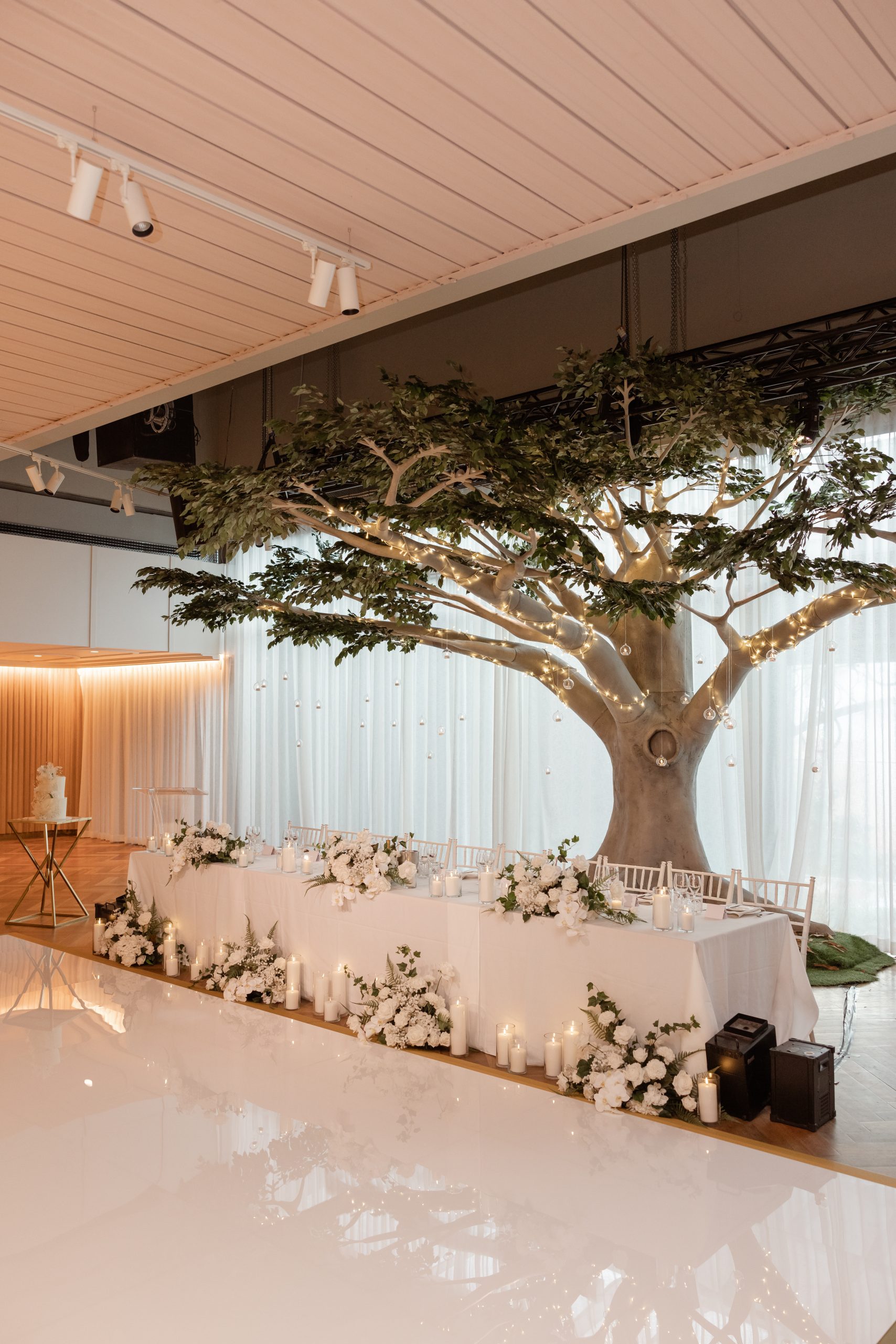 This wedding at The Rose Room in Cloudland featured an extra large faux fig tree as the reception focal point, surrounded by white florals, lush greenery, and pillar candles in glass holders. Gold mirror signage and styling details added a luxe finish to this elegant and elevated event.