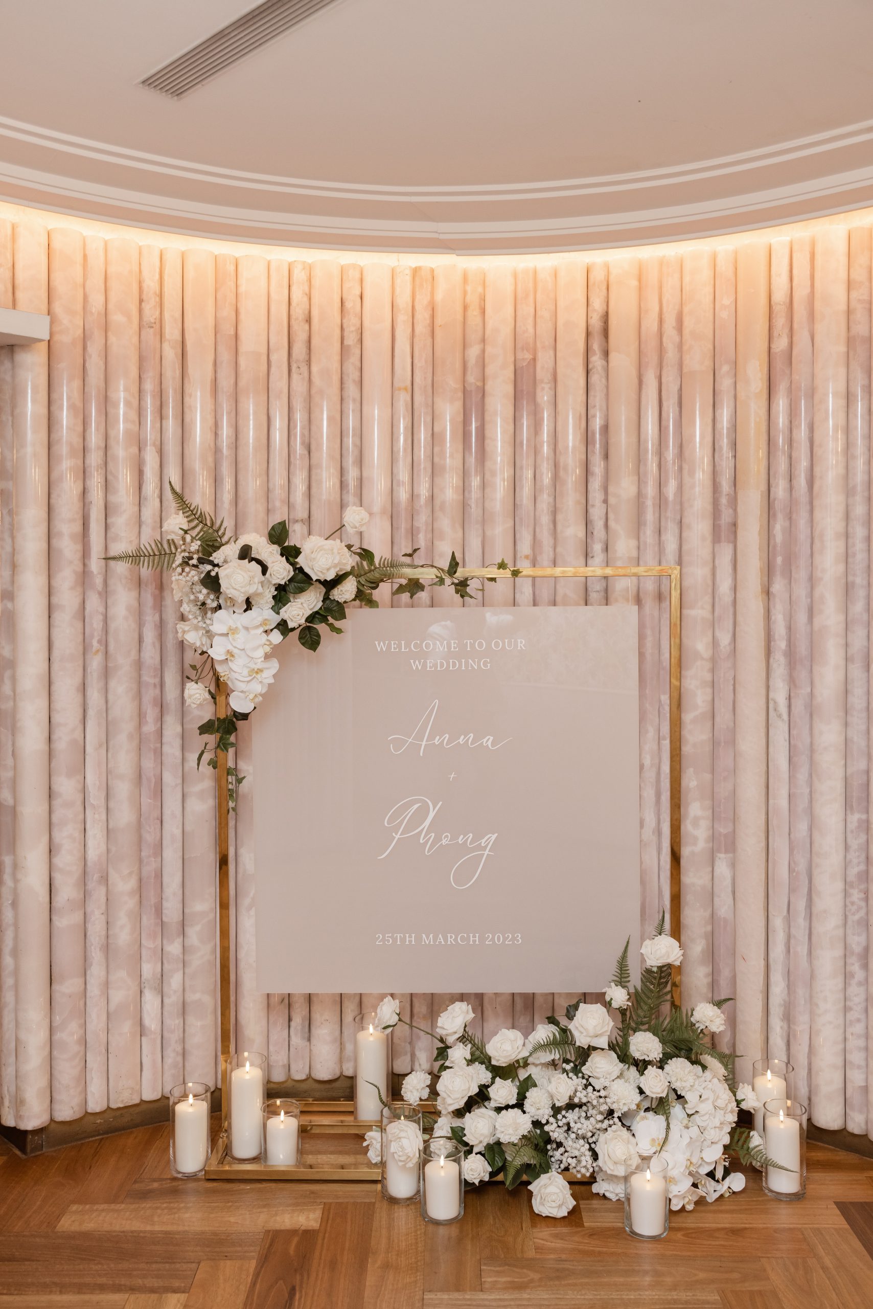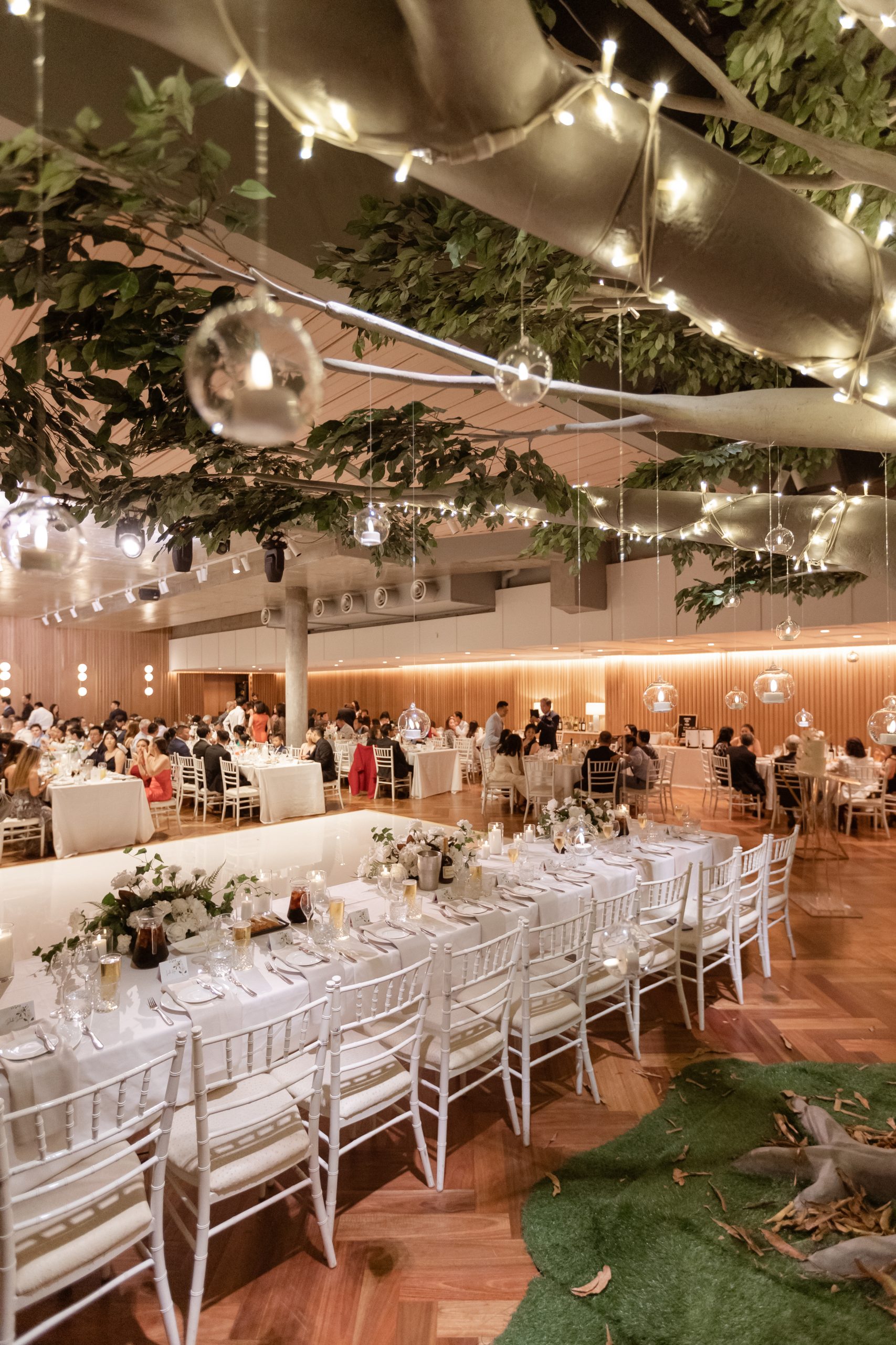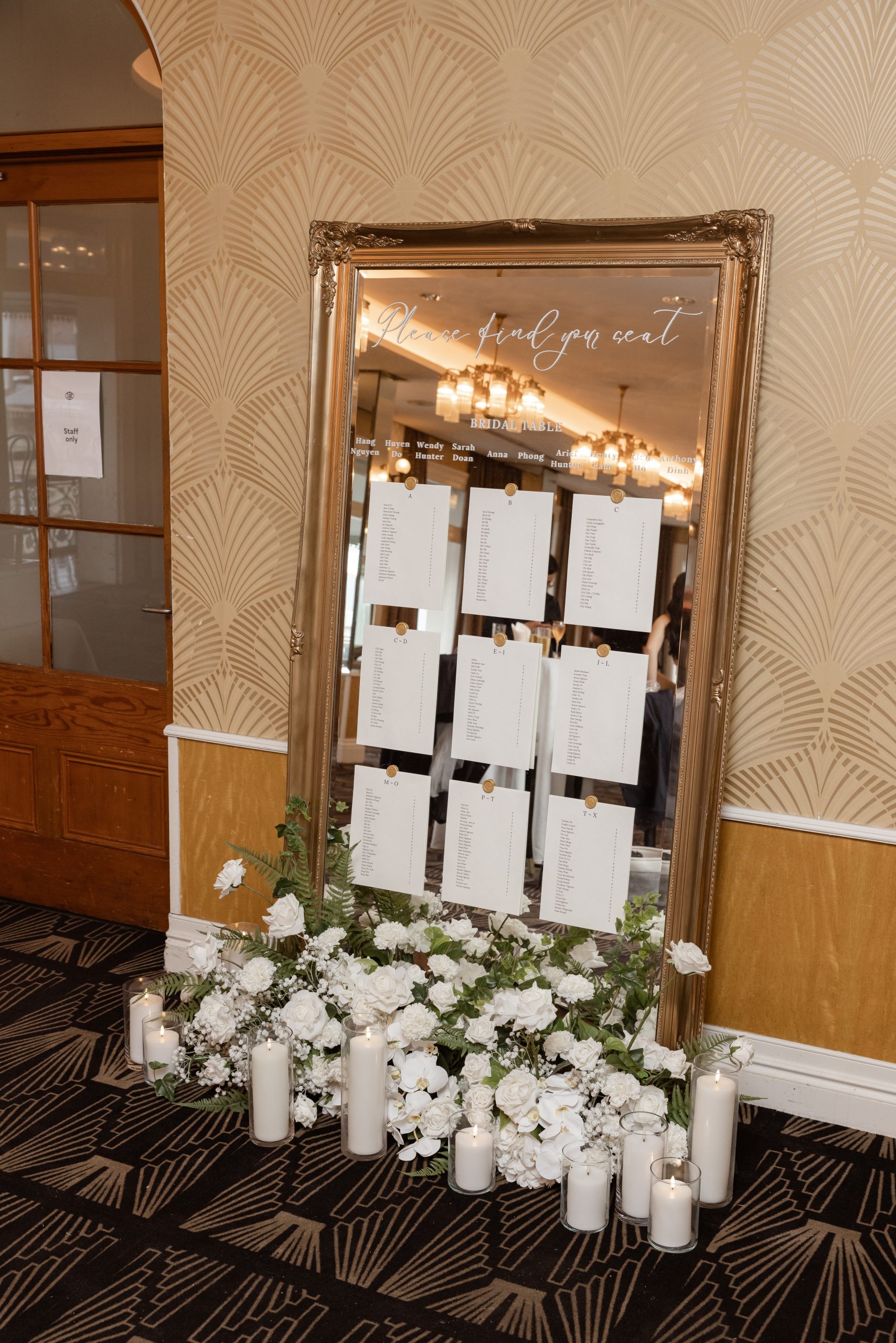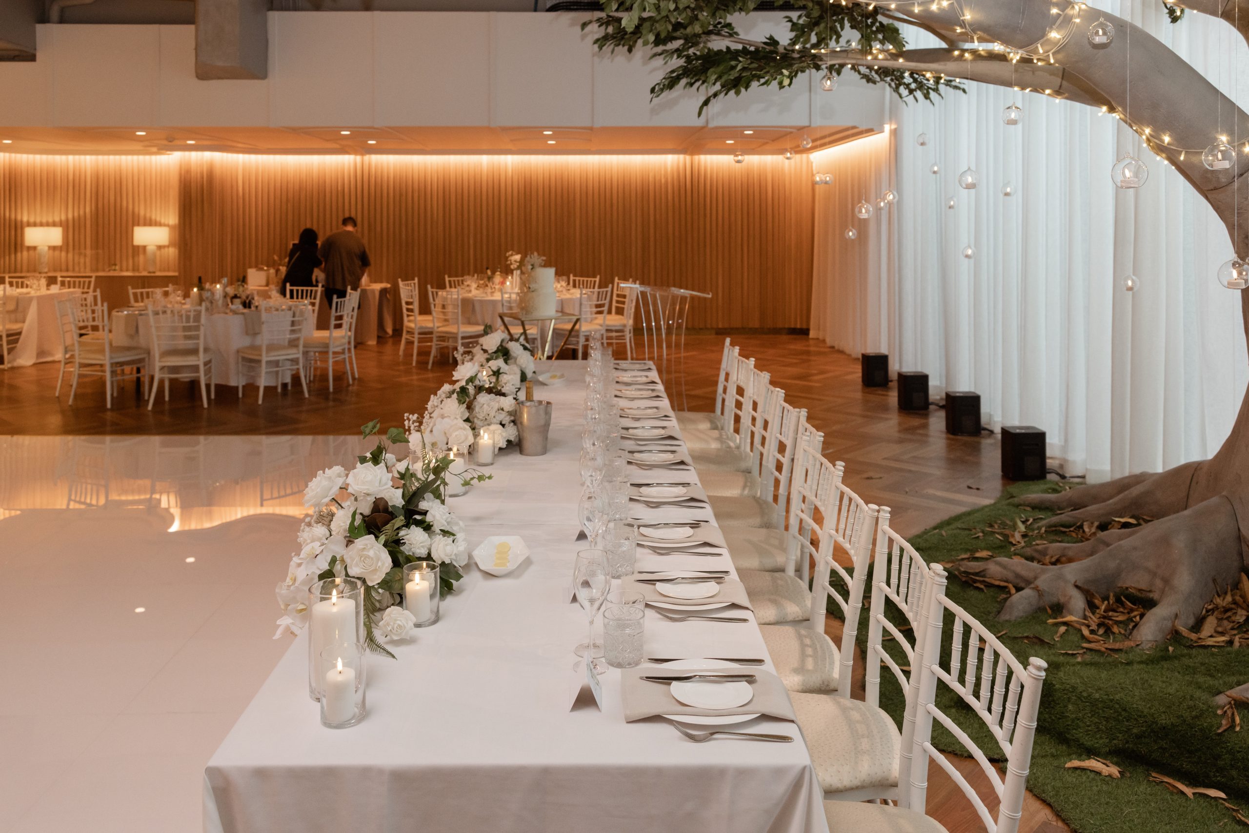 This wedding at The Rose Room in Cloudland featured an extra large faux fig tree as the reception focal point, surrounded by white florals, lush greenery, and pillar candles in glass holders. Gold mirror signage and styling details added a luxe finish to this elegant and elevated event.