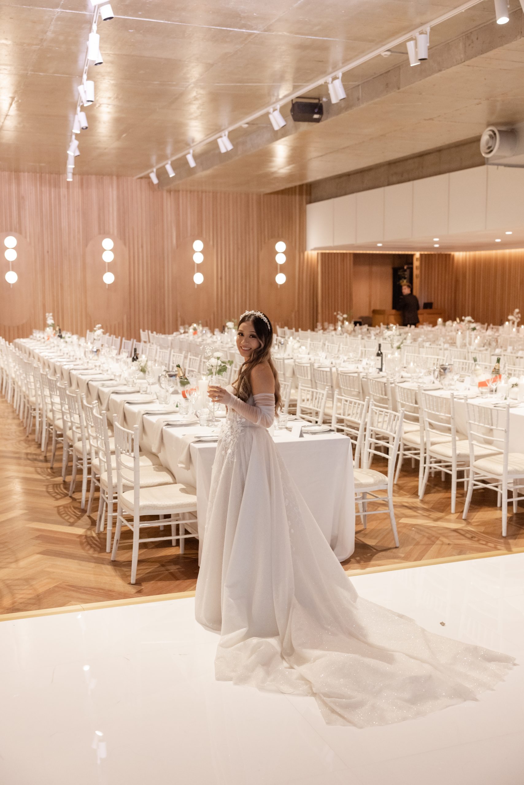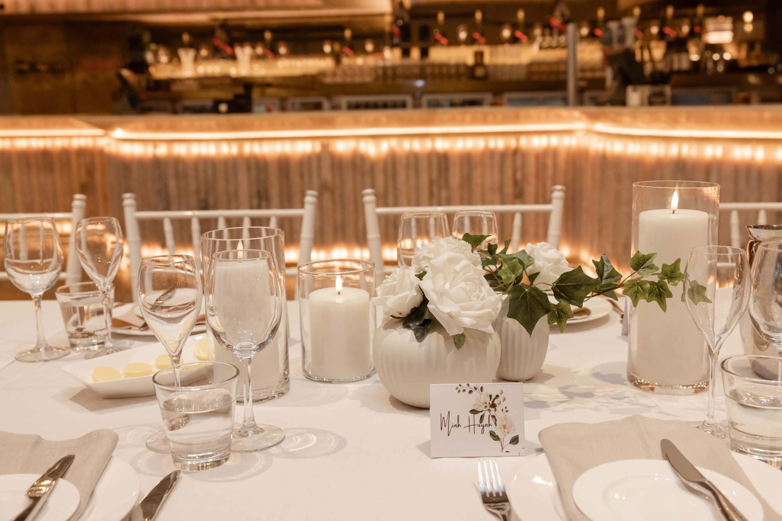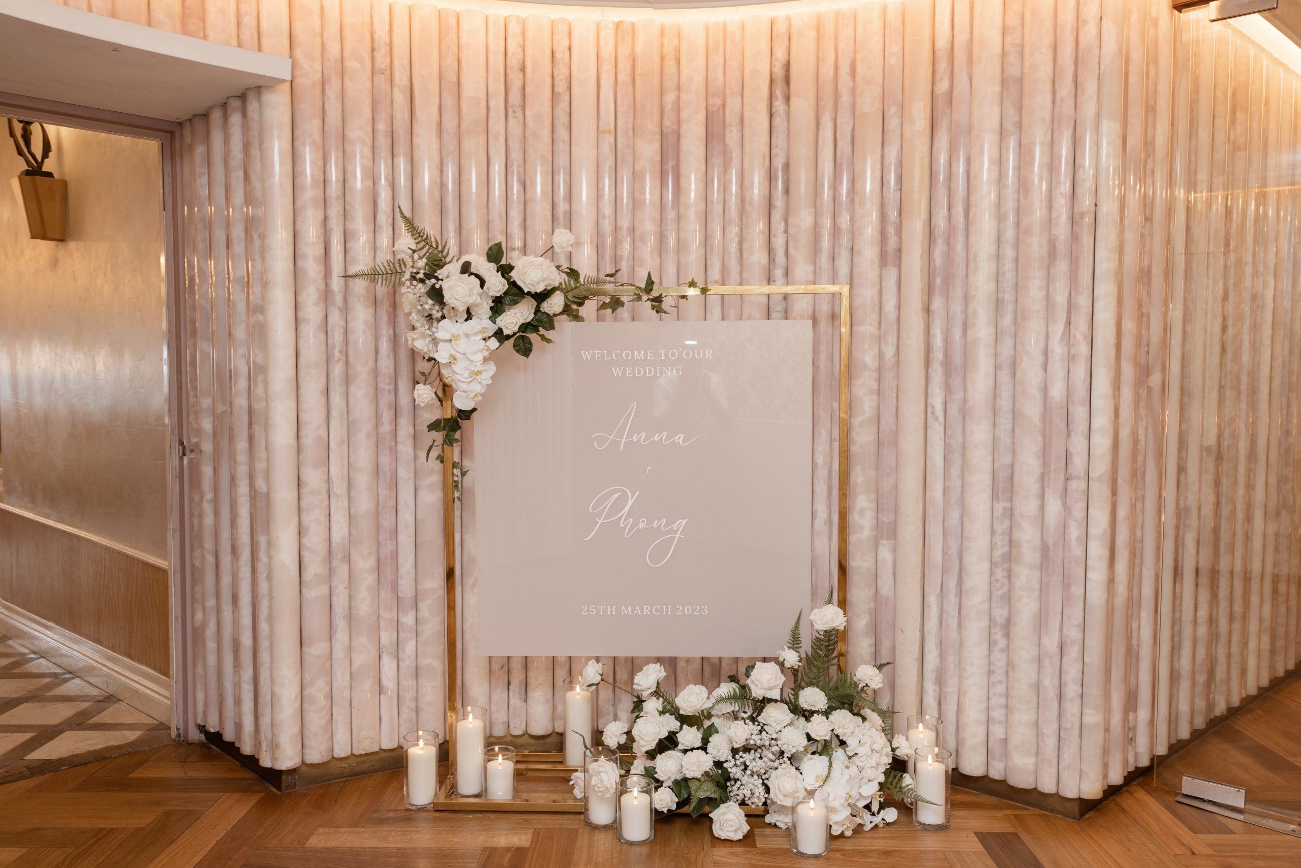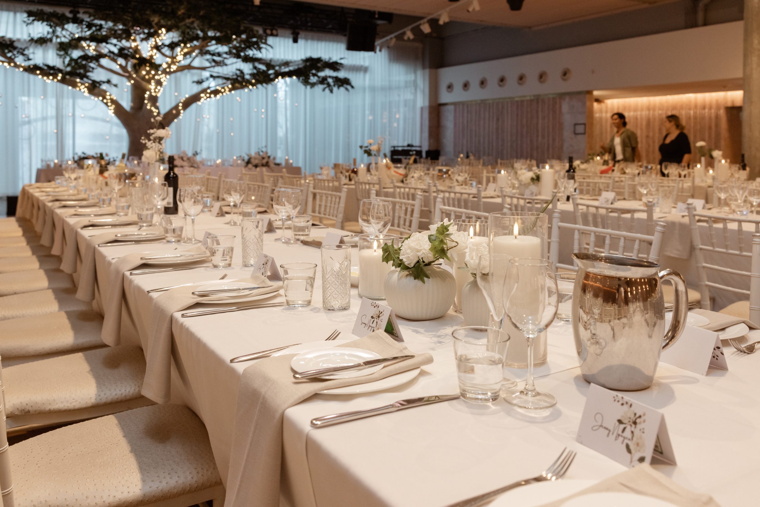 This wedding at The Rose Room in Cloudland featured an extra large faux fig tree as the reception focal point, surrounded by white florals, lush greenery, and pillar candles in glass holders. Gold mirror signage and styling details added a luxe finish to this elegant and elevated event.