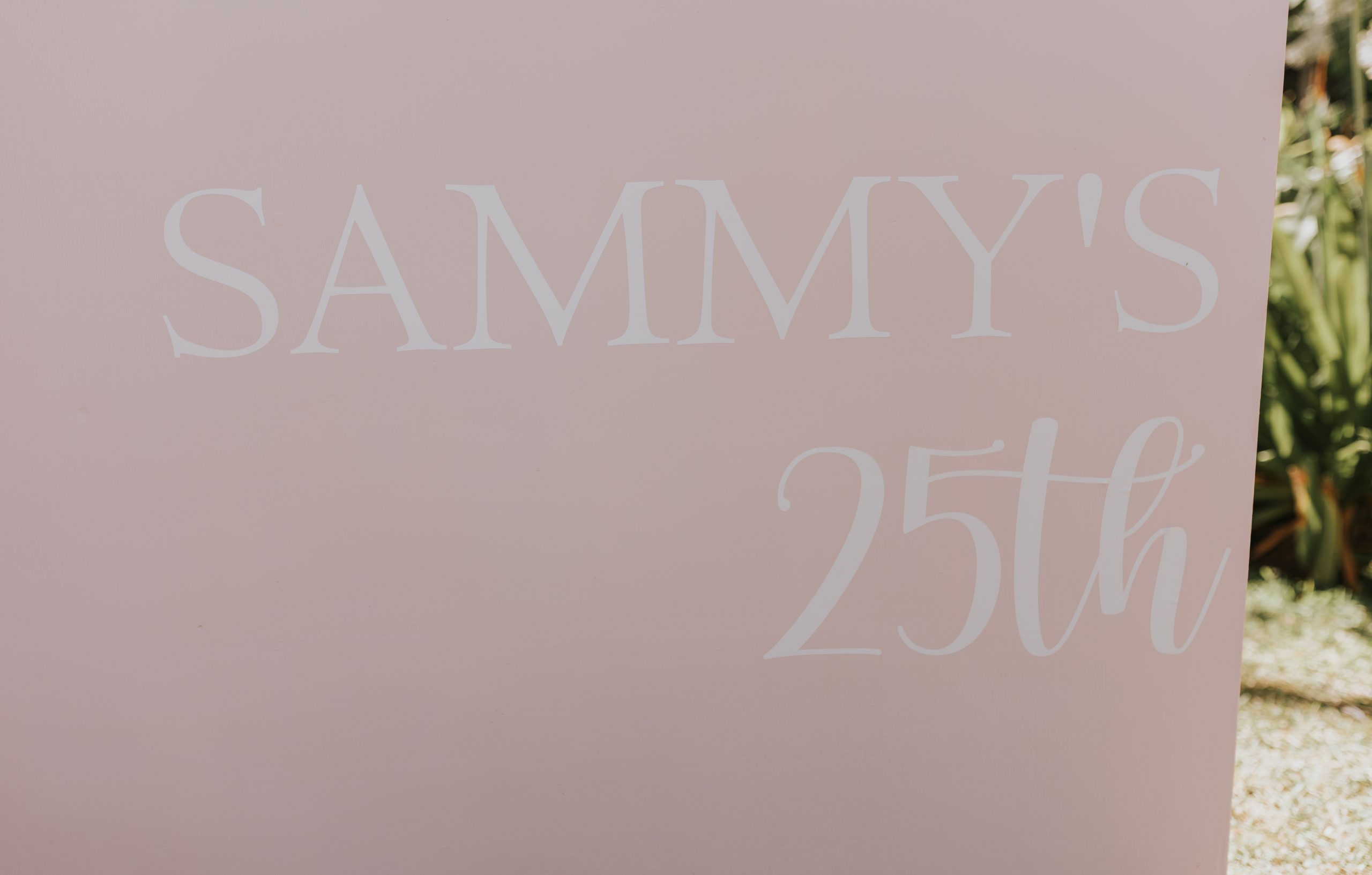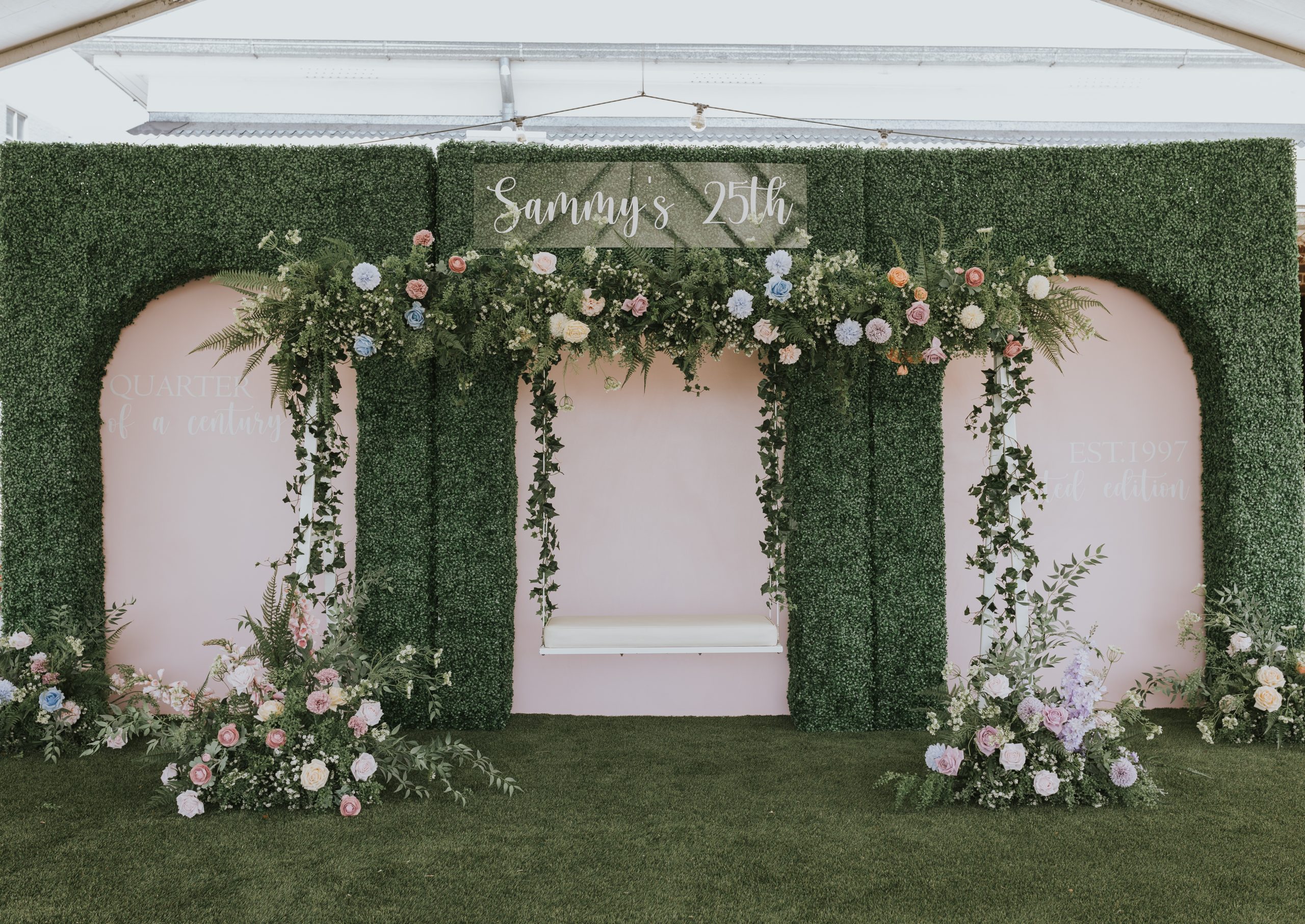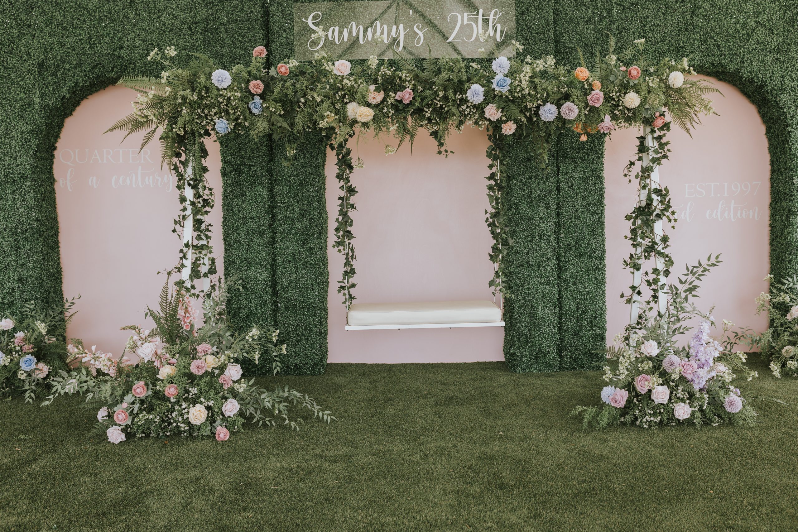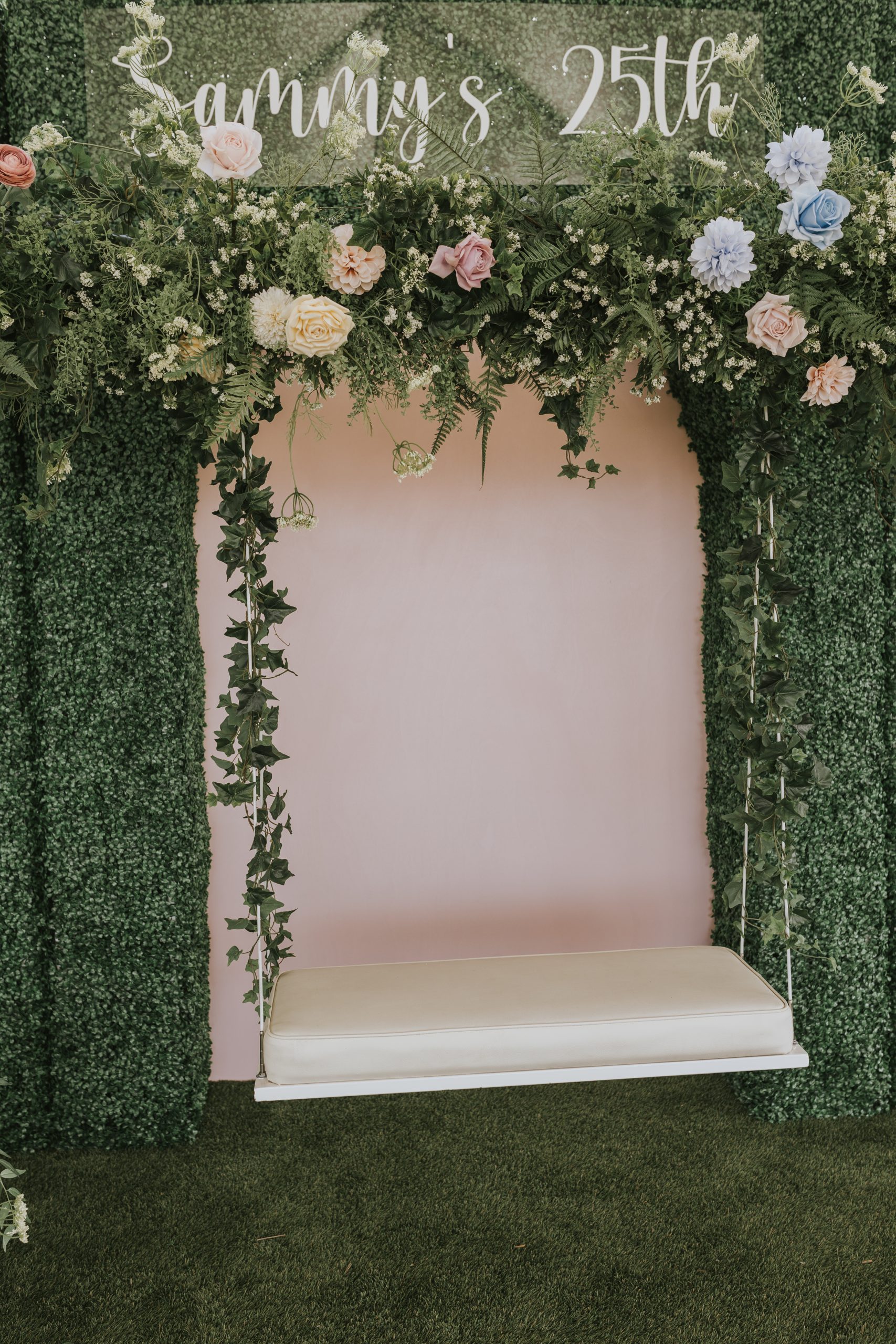 We created an intimate garden themed soiree for Sammy's 25th with fun activities including a garden swing, a fairy floss machine, and a white jumping castle. It was as entertaining and exciting as it sounds with the birthday girl dressed like a garden fairy to match the theme!
